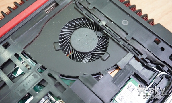 戴爾游匣7000游戲本的散熱整體設計都集中在了上半部分,風扇位于筆記本的上部兩角處,讓散熱鋼管進行交叉形成很好的覆蓋。