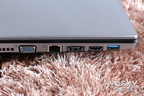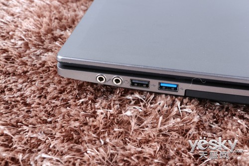 雷神G150S在這點(diǎn)上十分厚道,筆記本左側(cè)為電源接口、VGA視頻接口、RJ-45網(wǎng)絡(luò)接口、e-SATA接口、HDMI接口與一枚USB3.0接口。值得一提的是,e-SATA可以當(dāng)做USB3.0接口使用。右側(cè)為USB3.0接口、USB2.0接口和3.5mm耳機(jī)MAC接口。
