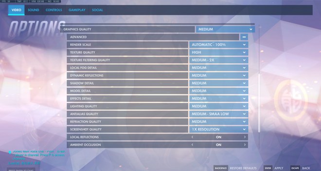 由于掠奪者 Helios 300 的屏幕為 1080p@60Hz,因此我們只要保證游戲能夠穩定在 60 幀以上即可。《守望先鋒》中,默認為這個掠奪者 Helios 300 開啟的是中等特效,具體設置如上圖 1。這樣的特效在游戲的主界面即可輕松獲得超過 100 幀的表現,即使是在游戲中,也能獲得 85~100 幀的幀數表現;而將特效設置至上圖 2 并開啟垂直同步時,也能穩定在 60 幀,初步印證了我前面提到在1080p@60Hz 下中等特效流暢玩游戲的結論。
