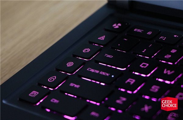 當(dāng)然,作為一款游戲本,炫彩的燈光效果也是少不了的。小米游戲本的燈效由兩部分組成,一部分是C面的鍵盤區(qū),另外一部分是機身兩側(cè)的燈帶。其中鍵盤部分,左側(cè)的五個可編程功能鍵為一個分區(qū),主鍵盤區(qū)組成另外三個分區(qū)。