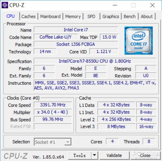 根據CPU-Z檢測出的數據,華碩靈耀X搭載的Intel Core-i7 8550U處理器擁有4核心8線程,工作主頻1.8GHz,睿頻最高可加速至4GHz,熱設計功耗為15W,采用的是14nm制作工藝和Kaby Laby架構。與入門級級Intel Core-i5 8250U處理器相比,它的主頻和睿頻都有所增加,可以滿足更多的日常辦公任務。