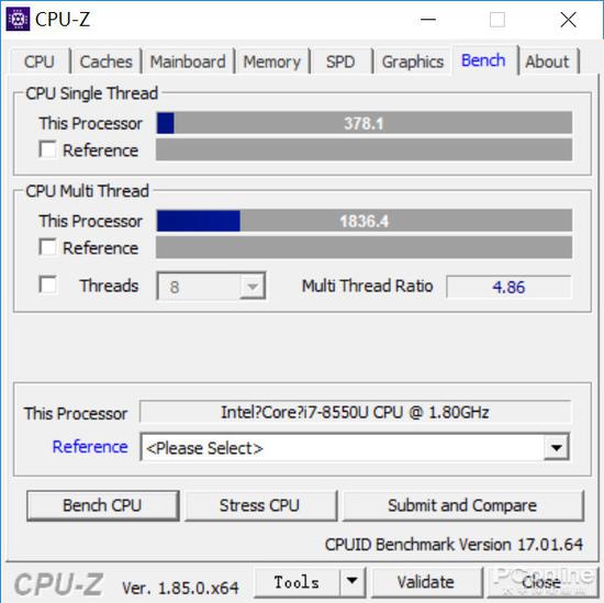 CPU-Z這款軟件還能夠測試處理器的性能,Intel Core-i7 8550U處理器的單核處理器為378分,多核處理能力得分為1836分。而Intel Core-i5 8250U處理器在這個軟件里的單核處理能力得分為300分左右,多核處理能力得分為1350分,Intel Core-i7 8550U處理器的性能的確高出了它不少。