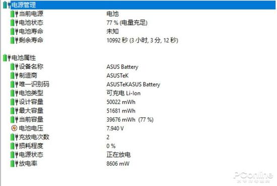 續航能力是衡量輕薄本性能的一個重要指標。根據ADIA 64檢測出的數據,華碩靈耀X的電池電量為51681mWh,是一塊大容量電池。而在PCMark 8續航能力專項測試中,華碩靈耀X跑出了4小時9分鐘的好成績。這樣的成績高出同類產品許多,在測試過程中,華碩靈耀X始終處于高負載的狀態,平時辦公并不要這樣,所以真是使用情況可能會比這個數據還高。所以拿著華碩靈耀X出差旅行是個極佳的選擇。除此之外,華碩靈耀X還擁有電池健康保護系統,用戶可以根據實際使用情況選擇適合的充電模式,有效延長電池的使用壽命,