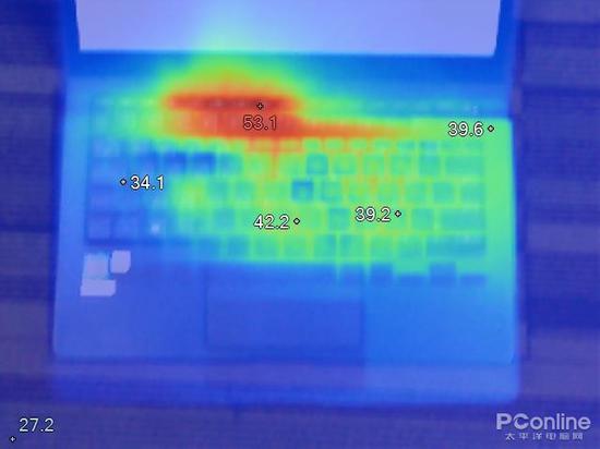 根據熱力圖顯示出的數據,華碩靈耀X的C面最高溫度為53.1℃,在出風口的位置。最為溫度為34.1℃,在AWSD鍵周圍。總體溫度約40℃左右。