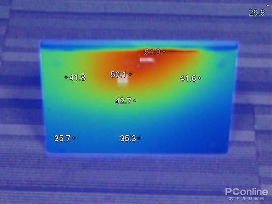 華碩靈耀X的D面,最高溫度為54.9℃,也在出風口附近。最低溫度在D面的下半部分,為35.3℃。而C面大部分的溫度都沒有超過36度。