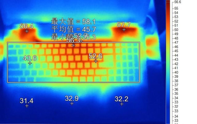 在經過15分鐘的雙烤模式后,CPU溫度在92℃,功耗45W,顯卡最高溫度78℃,頻率在1.5到1.6GHz左右浮動。但是讓我擔心的還是表面溫度,在鍵盤區域,溫度偏高區域集中在F7~F12處,最高溫度58.1℃,已經很燙手了。不過WSAD區域倒是相對涼爽,只有43℃左右,溫度分布還算合理。
