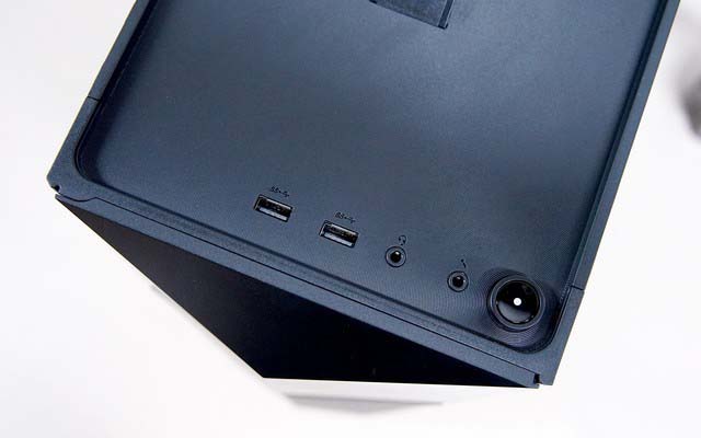 刃9000 3代前端接口位于頂部靠右側位置,2個USB 3.1接口、1組耳機和麥克風插孔方便用戶使用,旁邊設計有電源鍵。此外,前面板上部區域可以打開,預留有光驅位。