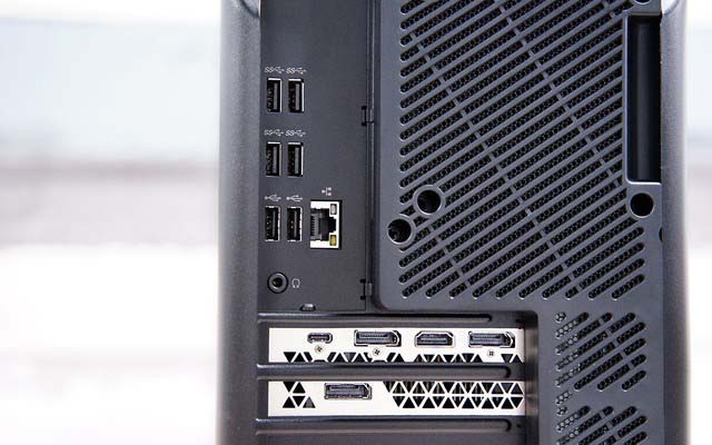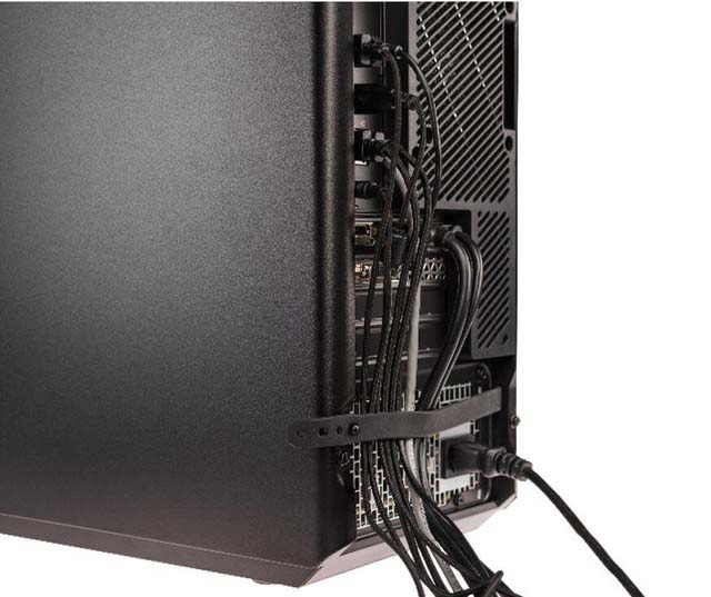接口方面,刃9000 3代主板配有4個USB 3.1、2個USB 2.0以及1個以太網口和1個耳麥混合插孔;所配RTX 2080獨顯配置了1個全功能TYPE-C、3個DP 1.4和1個HDMI 2.0,外接多屏非常方便。另外電源外側的理線帶也保留下來,理線效果示意如上所示。