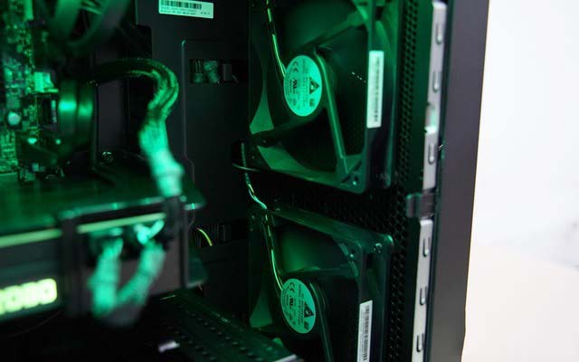 需要說明的是,目前我們拿到的刃9000 3代是工程機,所以背光控制軟件和主板BiOS還未匹配,因此暫時不能夠對機箱背光進行調節,默認開機之后顯示為綠色,契合了RTX 2080獨顯的“信仰色”。