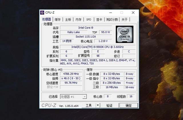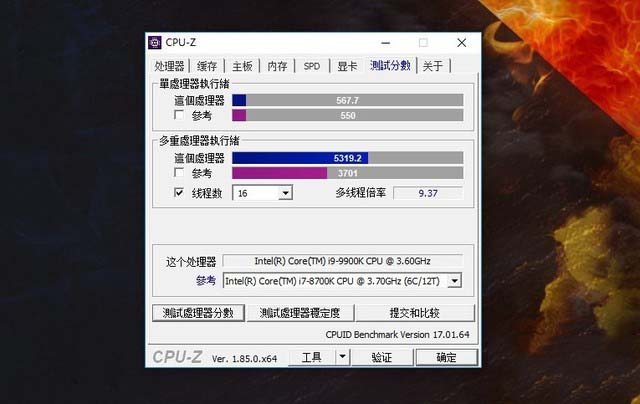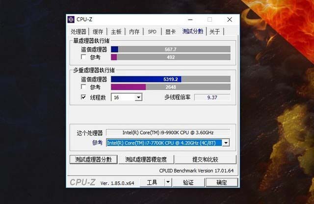 先看CPU-Z性能測試情況,通過測試可以看到酷睿i9 9900K單核評分567.7分,多核評分5319.2分,相對于酷睿i7 7700K來說性能提升超過2倍,相對于上一代酷睿i7 8700K來說性能也有較大幅度提升。