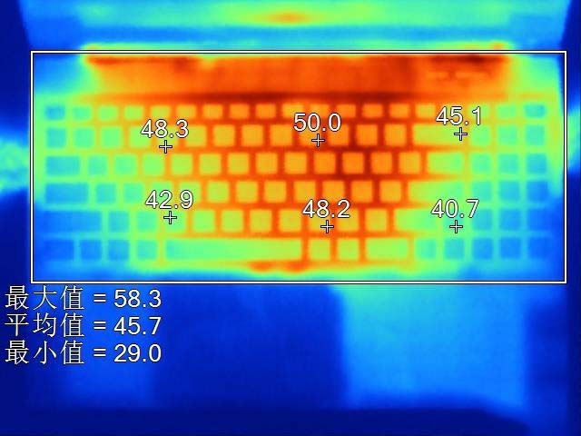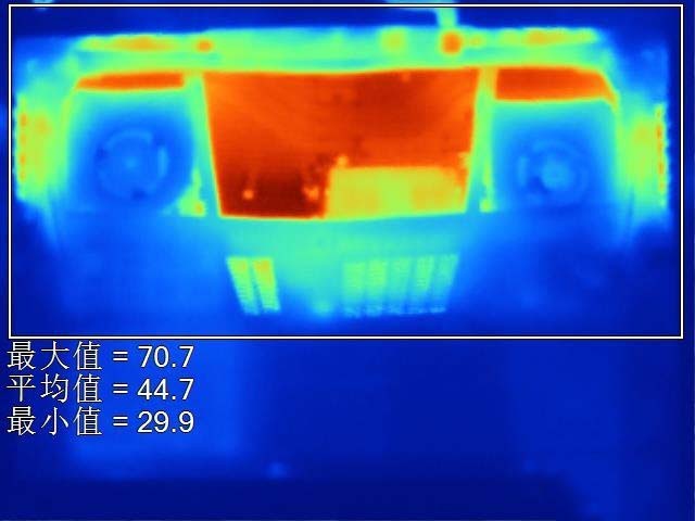 從熱成像儀數據來看,炫龍耀9000II發熱元件排布比較科學,集中在鍵盤中部以及靠上區域,與手掌交互較為頻繁的區域平均溫度為45.7℃,能夠較為明顯的感受到熱量,但總體體驗還是比較舒適的。