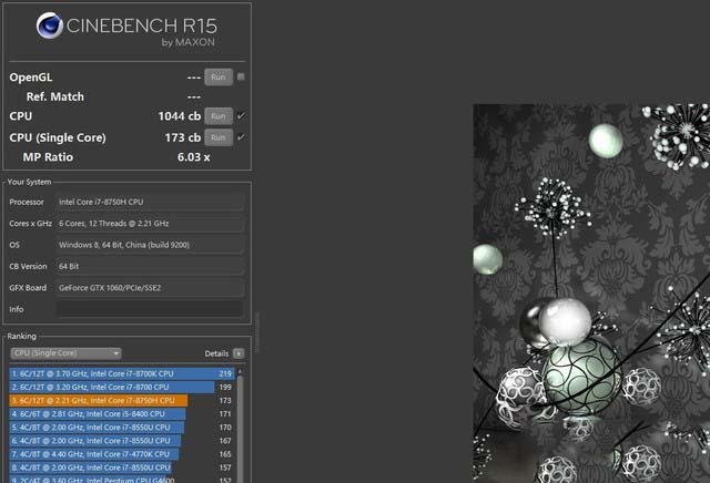 使用CINEBENCH R15對單核和多核性能做測試可知,其多核跑分為1044cb,單核跑分為173cb。從成績來看,多核分數處于酷睿i7 8750H處理器的中高水準。