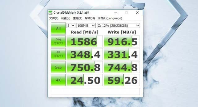 炫龍耀9000II在固態硬盤上選擇了256GB PCI-E固態硬盤,實測Seq讀取速度達到1586MB/s,寫入速度達到916.5MB/s,滿足基本的應用需求沒有問題。