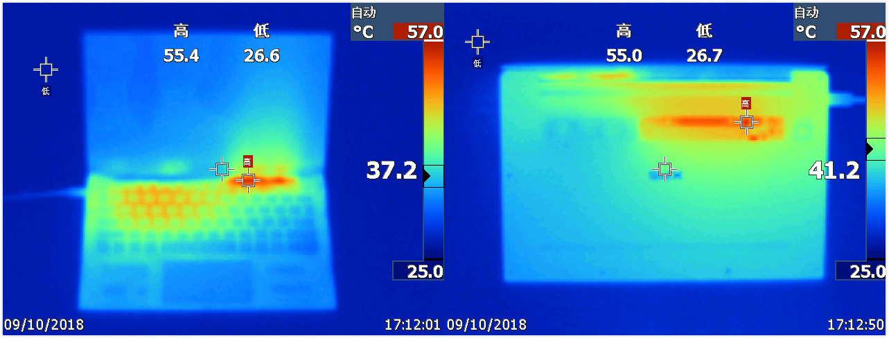 我們使用 AIDA 64進(jìn)行滿載測(cè)試,連續(xù)烤機(jī)1小時(shí)后使用熱成像儀對(duì)筆記本溫度進(jìn)行檢測(cè),從圖中我們可以看出,在滿載情況下,主要溫度都集中在筆記本散熱風(fēng)扇出風(fēng)口處。