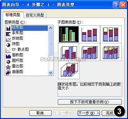 3. 默認“圖表類型”為“柱形圖”和子圖表類型(圖 3),單擊下方的“按下不放可查看示例”按鈕,可以看到將得到的圖表外觀的預覽。