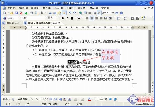 第三步:點擊文檔標簽并切換到目標文檔中,將帶有格式刷標志的鼠標光標向文字上進行拖曳,這樣格式就“克隆”到目標文檔的相應文字中了(如圖2)。