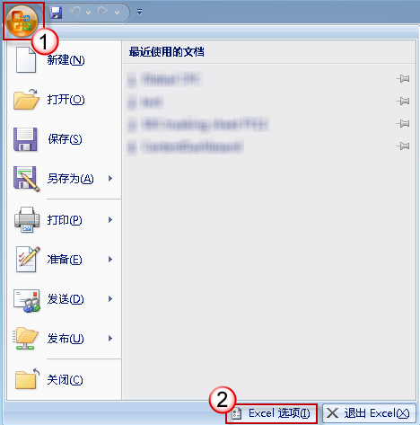在 Excel 2007 中,按一下左上角的 Office 按鈕,然后單擊“Excel 選項”。