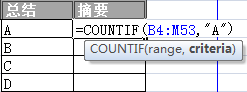 使用 COUNTIF 函數時,在范圍之后,請輸入搜索條件。舉例來說,如果想要統計輸入了“A”的單元格數量,則輸入“=COUNTIF(B4:M53,"A")”。