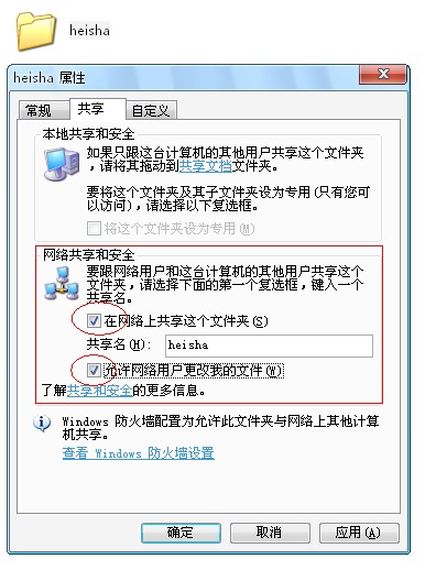 一、首先要保證你在局域網內網中聯網正常,在你的盤符下新建一個文件夾,比如我們在F盤建立一名為“heisha”的文件夾,新建后右鍵→屬性選擇該文件夾,在共享中共享此文件,如圖: