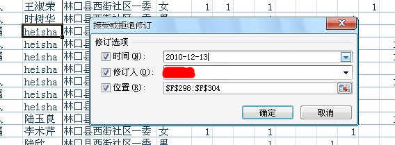 3. 接受或拒絕修訂。什么是接受或拒絕修訂呢?上圖我們看見,某用戶修改了七個heisha,我是這個設置工作薄共享的人,這個程序在我的機器中,這里的我, 相當于主機,而某用戶相當于訪問、協助我的作用,但是某用戶修改的這七個heisha我是否同意修訂(修改)呢?或者說,這七個heisha是誰修訂的 呢?看圖說話: