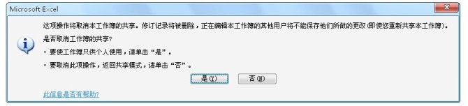 如果上面的你全部掌握的話,取消共享就非常簡單了,審閱→更改→共享工作薄→編輯→將允許多用戶同時編輯的對勾取消,確定后會出現提示,如圖。