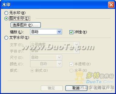 點擊菜單欄的“格式”——“背景”——“水印”,彈出“水印”設置窗口,先選擇水印類型:圖片水印或文字水印。如果選擇圖片水印,可以從硬盤中選擇一張圖片作為水印,并可設置圖片的縮放和沖蝕。如果選擇文字水印,可以自己輸入作為水印的文字,并設置其字體、尺寸、顏色等。