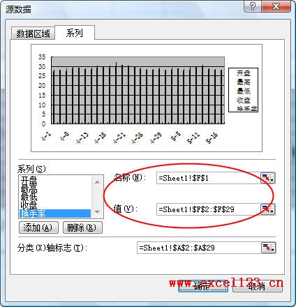 2.添加“換手率”系列:選擇圖表,單擊菜單“圖表→源數(shù)據(jù)→系列”,在對(duì)話框中單擊“添加”按鈕,將“名稱”設(shè)置為F1單元格,將“值”設(shè)置為F2:F29區(qū)域。