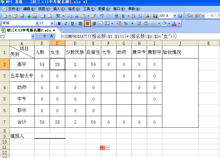 同理,我們在B4單元格中輸入“=SUMPRODUCT(((報名冊!$I:I="")*(報名冊!J:J="")*(報名冊!$K:K=3)))”統計 出報考幼師的學生人數。以此類推,可在B5、B6中輸入統計中專和職中報考人數的函數,并比照高中類的函數格式在其余單元格中建立統計女生數、少數民族數 等信息的函數。
