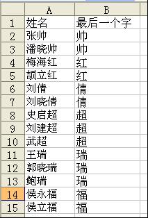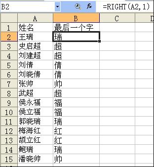 下面我們來提取姓名的最后一個字。這里要用到前面介紹過的函數 right( ),在B2單元格中輸入" =RIGHT(A 2 ,1) "。 然后向下拖到鼠標進行填充,那么每名同學的最后一個字就提取出來了。如圖6-1-13所示。