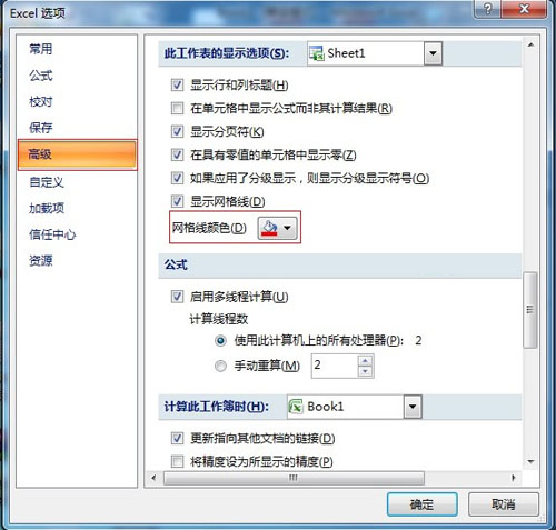 2、在“Excel選項”→“高級”中找到“此工作表的顯示選項”下面的“網格線顏色”,選擇自己喜歡的顏色,確定即可。