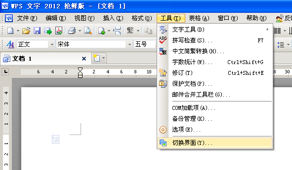 2、在經典風格界面下,單擊“工具”菜單下的“切換界面”命令(如圖6),在彈出的“切換界面”話框里單擊“確定”按鈕(如圖7)后,重新啟動WPS2012即可切換回2012風格界面。