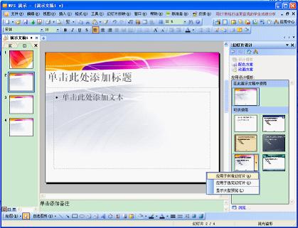 第二步,使用自動的幻燈片設計,有已經配好的背景色和格式,方便直接使用。“格式”——“幻燈片設計”,如圖2,選中一種設計方案,應用到所有幻燈片(因為要風格統一,所以選用一致的設計方案;如果有特別需要,也可以在同一個幻燈片中使用多種設計方案)。