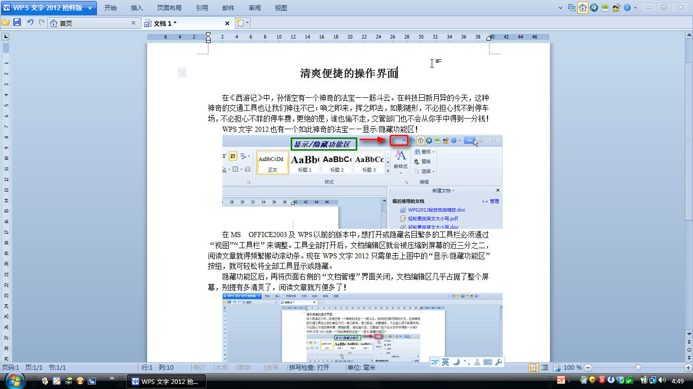 在《西游記》中,孫悟空有一個神奇的法寶——筋斗云。在科技日新月異的今天,這種神奇的交通工具也讓我們神往不已:喚之即來,揮之即去。wps文字2012也有一個如此神奇的法寶——顯示/隱藏功能區!
