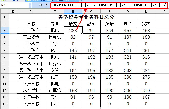 先建好空白表格,如圖2所示錄入學(xué)校名稱和專業(yè)名稱。在N2單元格輸入公式 “=SUMPRODUCT(($B$2:$B$16=$L3)*($C$2:$C$16=$M3),D$2:D$16)”,選中該單元格的填充句柄,向右和向下拖動復(fù)制公式至整個表格,那么各學(xué)校各專業(yè)各學(xué)科的總分就有了。不太難吧?