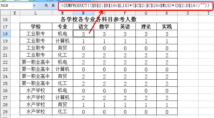 求和與求平均分只有一步之遙,那就是需要統(tǒng)計(jì)出各學(xué)校每個專業(yè)的人數(shù)。有了它,那么平均分就簡單多了。這同樣可以使用SUMPRODUCT函數(shù)來完成。