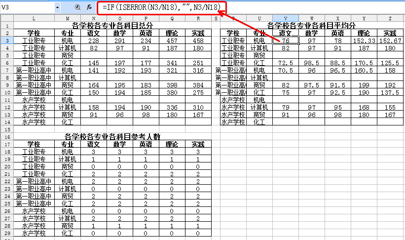 求平均分即拿總分除以人數(shù)。因此,如果人數(shù)為“0”,那么求平均分時就會出現(xiàn)問題。因此,在求平均分時,同樣需要用IF函數(shù)做一個判斷。借用前面的兩個表格,那么工業(yè)職專機(jī)電專業(yè)的語文平均分公式可寫為“=IF(ISERROR(N3/N18),"",N3/N18)”,其余的復(fù)制公式即可,如圖4所示。