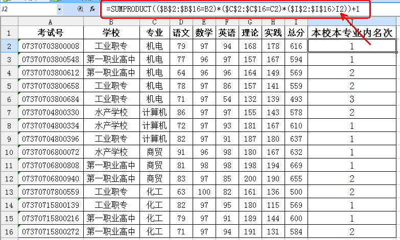 在不破壞原來數(shù)據(jù)表排序的情況下,為每位學(xué)生排定在本校本專業(yè)內(nèi)的名次,看起來很難,但是有了SUMPRODUCT就不一樣了。試想一下,借助于SUMPRODUCT函數(shù),我們可以輕松統(tǒng)計(jì)出符合多個條件的人數(shù)。那么工業(yè)職專機(jī)電專業(yè)總分為“616”的同學(xué)的名次,不就是學(xué)校為“工業(yè)職專”、專業(yè)為“機(jī)電”、總分“>616”的人數(shù)再加上1嘛!