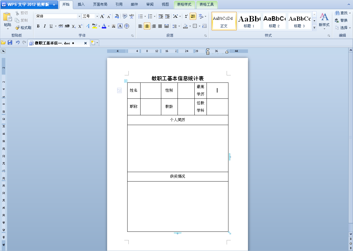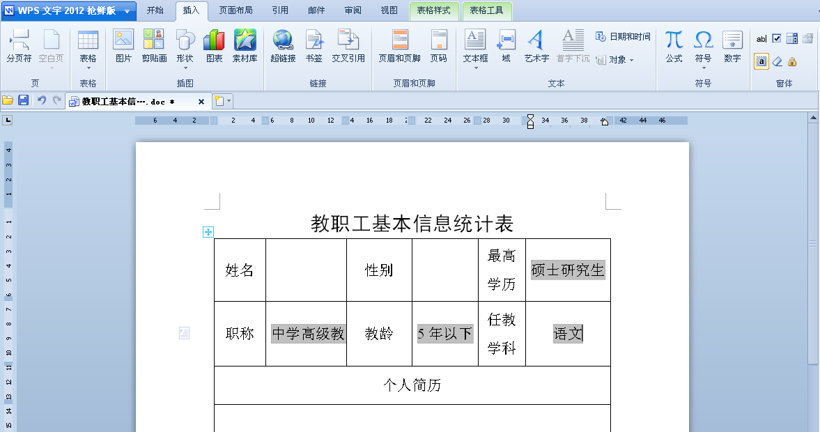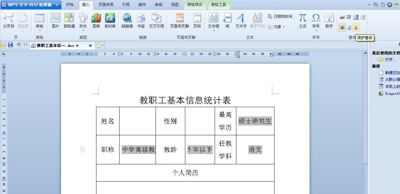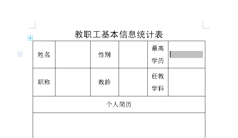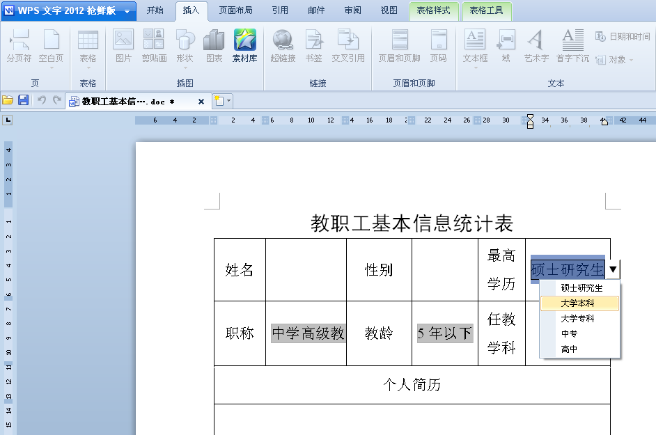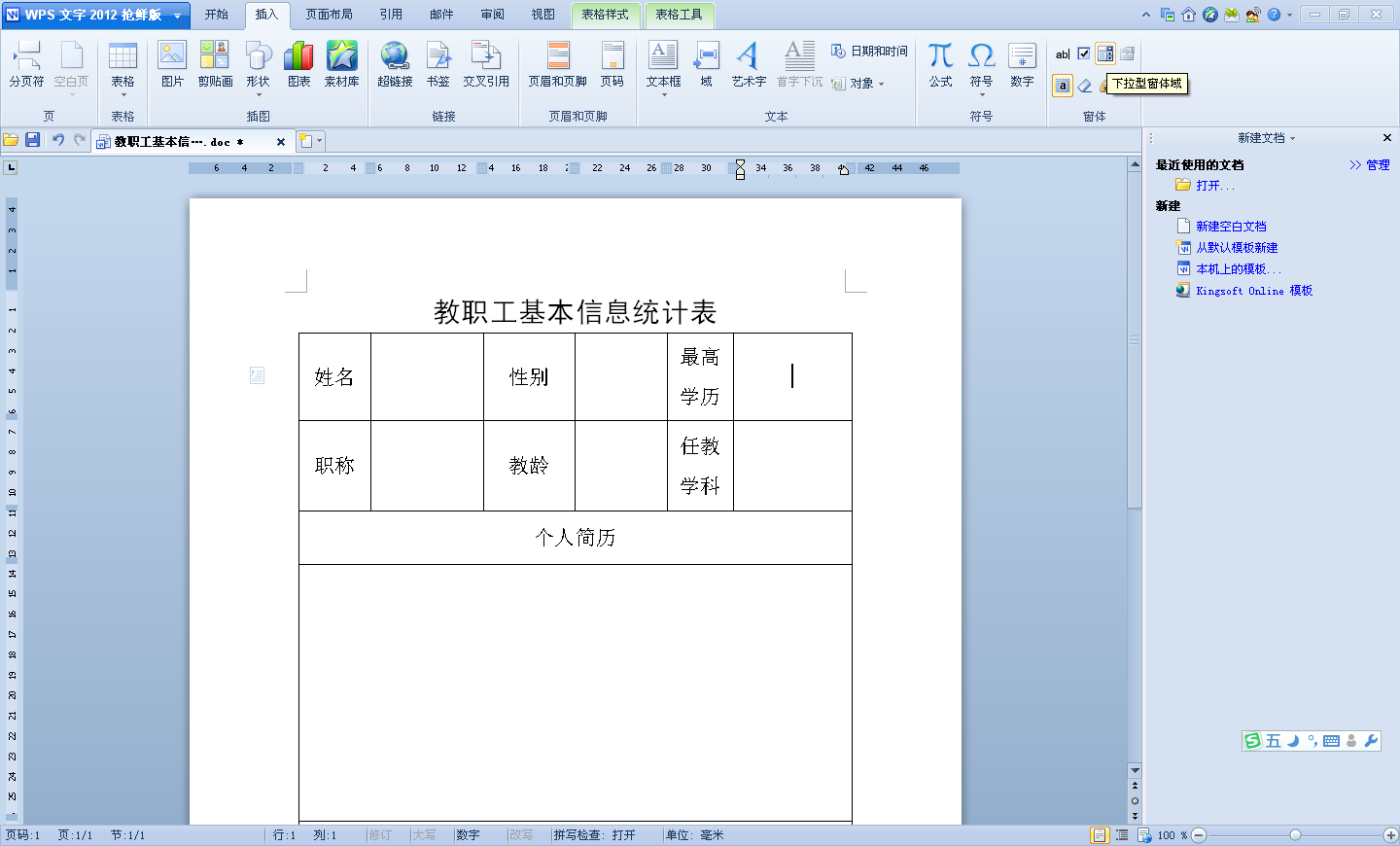1、完成空白表格的制作(如圖1)以后,將光標定位在“最高學歷”右側(cè)的單元格內(nèi),單擊“插入”菜單下“窗體”功能區(qū)里的“下拉型窗體域”按鈕(如圖2),在單元格里會出現(xiàn)一個灰色的長方形(如圖3)。