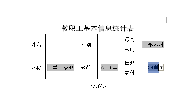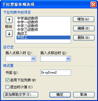 3、將光標定位在“職稱”右側(cè)的單元格內(nèi),按照上面的操作插入一個新的下拉型窗體域,并為其增加“中學高級教師”、“中學一級教師”、“中學二級教師”、“中學三級教師”、“高級工”等選項(如圖7)。