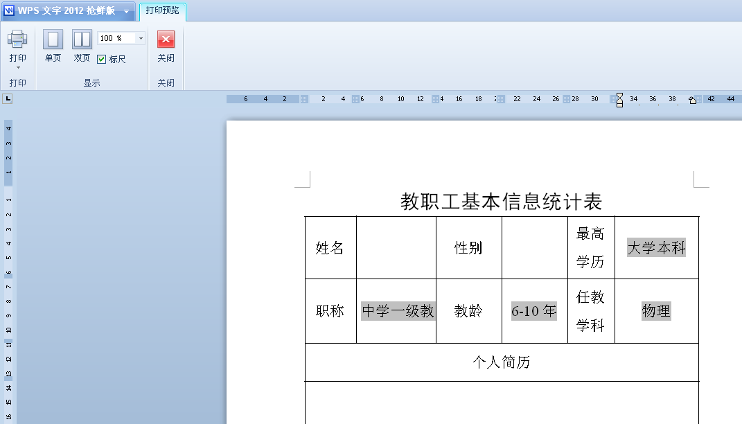 5、完成“姓名”、“性別”等普通單元格中內(nèi)容的輸入以后,單擊“窗體”功能區(qū)里的“保護窗體”按鈕(如圖9),用鼠標單擊下拉型窗體域,在彈出的下拉列表里單擊所需的選項(如圖10),即可完成單元格內(nèi)容的填寫(如圖11),打印預(yù)覽效果如圖12。