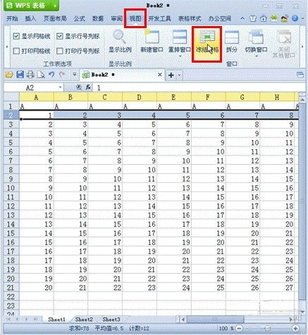 在WPS表格上方的工具欄里找到“視圖”的選項(xiàng)卡點(diǎn)擊,在“視圖”的選項(xiàng)卡里選擇“凍結(jié)窗格”的按鈕。如圖2所示。
