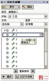 4、選中上述插入的圖片,執行“幻燈片放映→自定義動畫”命令,展開“自定義動畫片”任務窗格(如圖二)。