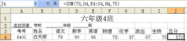 我們在 J4單元格中可以輸入 =sum(C4:I4) ,還可以輸入 =sum(c4,d4,e4,f4,g4,h4,i4) ,還可以這兩種方式混合著寫,如 =sum(c4,d4:f4,g4:i4),還可以直接輸入數(shù)字,如=sum(78,d4:f4,g4:i4),以上輸入法最終效果都是相同的,具體用哪種可以根據(jù)個人愛好決定。