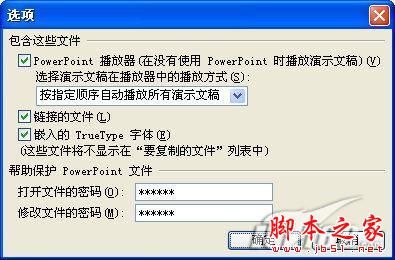 添加好幻燈片文件后點擊“選項”按鈕來設置一下播放的參數,在“選項”窗口中選擇“PowerPoint播放器”,把“按指定順序自動播放所有演示文稿”選中,這樣就可以自動播放幻燈片了,再把“嵌入TrueType字體”和“鏈接的文件”也選中,如果你的幻燈片文件內容比較重要,那我們還可以來設置密碼,保護光盤里面幻燈片文件的安全。設置好后點擊界面上的“復制到CD”按鈕就可以把這些幻燈片直接刻錄到光盤上了(如圖2)。