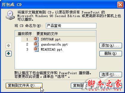 操作的方法和“打包到CD”的方法差不多,先點擊菜單“文件-打包成CD”,在“打包成CD”窗口中選擇一下要打包的幻燈片文件,接著點擊“選項”按鈕來進行一些基本設置,按住上面的設置也可以,設置好后我們點擊“打包成CD”窗口上的“復制到文件夾”按鈕(如圖3)。