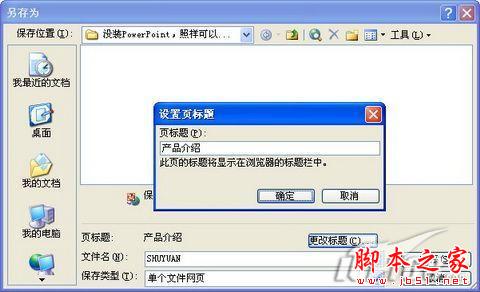 用PowerPoint打開要做成網頁的幻燈片文件,接著點擊菜單“文件-另存為網頁”,在彈出的“另存為”窗口中點擊“更改標題”按鈕來改一下幻燈片在網頁中的標題名稱,在“保存類型”中選擇“單個文件網頁”,然后設置一下保存的文件名和保存目錄,點擊“保存”按鈕,生成網頁文件后,我們只要把它們上傳到網上的空間就可以了(如圖5)。
