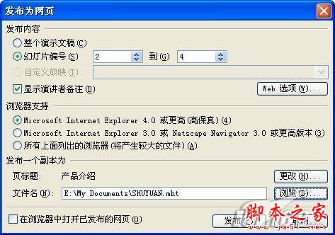 有時候我們只要保存整個幻燈片中的部分內容,那可以用PowerPoint打開要制作網頁的幻燈片文件,接著點擊菜單“文件-另存為網頁”,在彈出的“另存為”窗口中點擊“發布”按鈕,彈出“發布為網頁”窗口,選中“幻燈片編號”,在后面的選擇框內輸入幻燈片的起始編號和結束編號,如果需要顯示備注的話,還要把“顯示演講者備注”選中,然后設置一下支持的瀏覽器版本,一般都是選擇第一個“Microsoft Internet Explorer4.0或更高”,最后選擇網頁保存的目錄,可以點擊瀏覽按鈕來選擇,全部設置好后點擊“發布”按鈕就可以了(如圖6)。