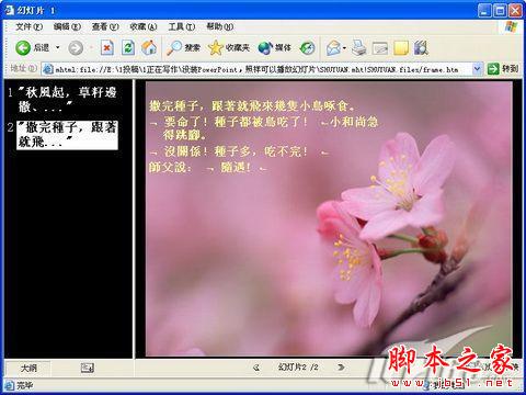 在生成的幻燈片網頁中,雙擊里面的網頁文件就可以看見效果了,點擊網頁右下角的“幻燈片放映”按鈕,瀏覽器還可以以全屏的方式進行播放,效果和在PowerPoint2003播放差不多(如圖7)。
