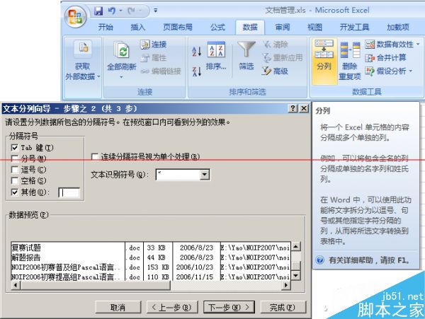 在PrintFolder軟件右側的搜索結果框中,右擊打開快捷菜單,依次執行“全選”和“復制”命令,復制上述搜索結果;然后打開Excel2007,將其全部粘貼到一個新工作表當中,然后選定該列數據,執行“數據-分列”命令,通過“文本分列向導”,選擇文本分隔符號為“|”,將各個文檔屬性值分列顯示(圖3)。