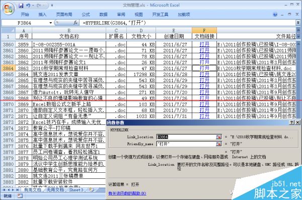 根據表格內容,設置好對應的Excel表頭。如果想讓文檔目錄檢索更為方便一些,可以選定整個數據區域,將文檔按指定屬性值進行排序,這里以文件類型為主要關鍵字,以創建日期為次要關鍵字進行排序。在F列中插入HYPERLINK函數,該函數的作用是“創建一個快捷方式或鏈接,以便打開一個存儲在本地硬盤、局域網服務器或Internet上的文檔”,Link_location參數表示文件路徑,這里對應G列中的內容,Friendly_name參數表示超鏈接的名稱,這里設置為“打開”,將該函數復制應用到整列單元格,即可完成文檔鏈接的創建操作(圖4)。